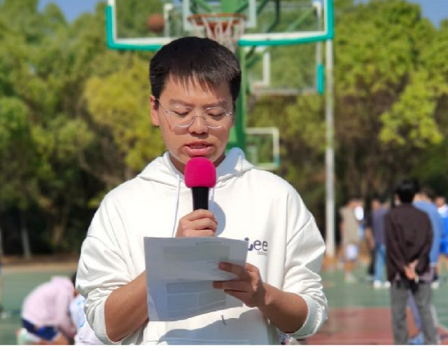 首先,辅导员颜宸对本次篮球赛致开幕词,在颜老师的精彩言辞中包含着对本次篮球赛的期待与祝福,在鼓励各班级参赛人员积极比赛的同时强调了本次比赛的宗旨:友谊第一,比赛第二。