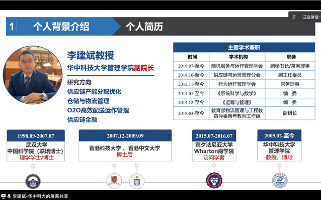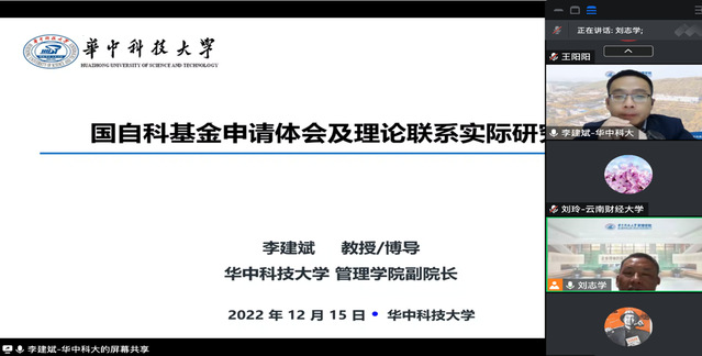 2022年12月15日晚8:00-9:30,球速体育管理公司副经理李建斌教授,做了题为《国家自然科学基金项目申请体会及理论联系实际研究分享》的学术讲座,并进行了研讨交流。本次活动是“基于央地融合的物流管理专业虚拟教研室”的系列教研名师科研分享研讨会活动之一,由虚拟教研室负责人、教育部物流管理与工程类专业教指委副主任委员、球速体育刘志学教授主持,公司和球速体育、上海海事大学、武汉理工大学、南京信息工程大学、重庆工商大学、云南财经大学等虚拟教研室共同建设高校的共计100多名师生参加了此次研讨活动。