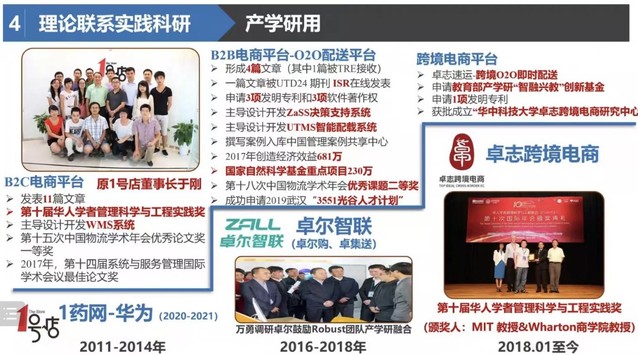 李建斌教授在理论联系实践科研中提出要产学研用,从自身举例子,从学术新人奖、华中学者(晨星岗)华中卓越学者、光谷人才计划、湖北省教育厅楚天学者、教育部新世纪优秀人才到教育部青年长江学者,在各个发展阶段过程中论文的撰写方法,比如论文选题之创新方法:P2P法(通过阅读其他论文来发表论文,特别是高质量的论文)和I2P法(通常在产业实践中会发现比读过的文章更有趣的新问题),突出创新特色,敢于提出问题,做好创新实践,做到产学研用。李建斌教授的国家自然科学基金重点项目“O2O模式下即时配送服务运作管理的理论与方法”就是Robust团队与B2B电子商务平台卓尔控股有限公司的深度合作,研究成果除了发表多篇高质量SCI论文以及主导设计开发ZaSS系统(O2O货运卓集送平台)以外,专利成果应用于卓集送的联合配送管理系统-UTMS,用于解决美团快驴的智能配载需求,并帮助卓集送荣获美团快驴“配送优秀供应商”获奖,2017年创造经济效益681万元。