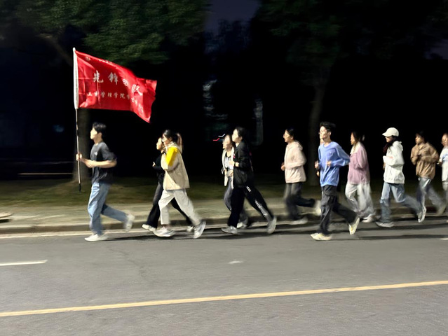 晚上9点,晚跑正式开始。队伍整齐划一,从东大门升旗台出发,沿着腾龙大道慢跑。一路上,他们步伐坚定,齐声高呼“笃志坚韧,求实上进”,互勉互励,共同前行。晚跑结束后,全体参与人员针对此次晚跑活动的感受进行了交流。最后,全体参与人员在北大门校训石处合影留念。