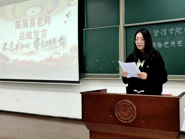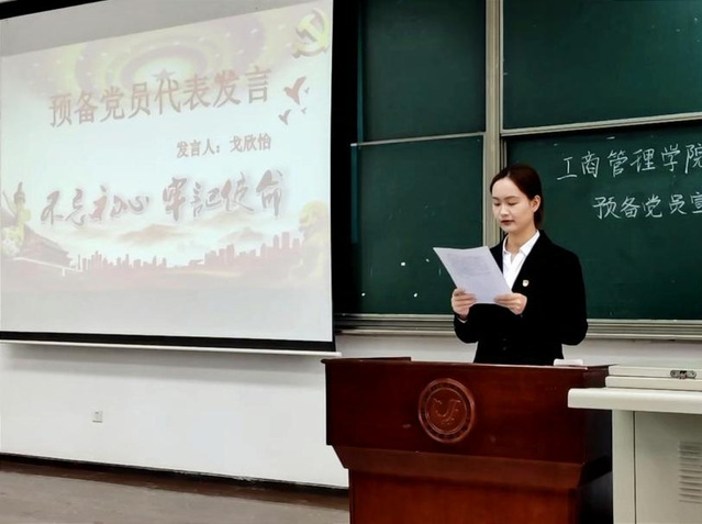 预备党员代表戈欣怡同志回忆入党的点滴历程,在表达喜悦的同时,向党组织庄重承诺:在未来发展道路中,将始终保持思想清醒、信念坚定,在思想上行动上政治上与党中央保持高度一致;主动作为、敢于斗争,练就过硬本领,以实际行动践行党的宗旨;严于律己、慎独慎微,常态化进行批评与自我批评,在细微之处亦不失党员本色。