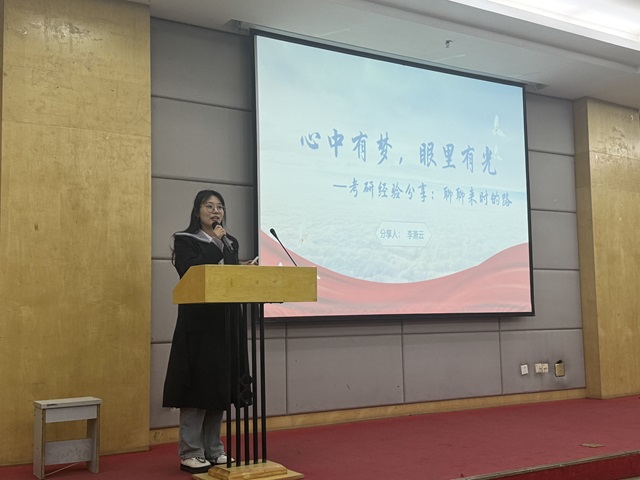 在分享会上,李萧云学姐以“心中有梦、眼里有光”为题,结合自己的考研过程经验给学弟学妹们做了报告,她从院校专业选择、初试各科目备考经验、复试内容以及时长不等于真知识五个关键点着手,这些直击要害的建议让同学们受益匪浅。最后,她对即将考研的同学给予了鼓励,勉励他们好好学习,认真备考。