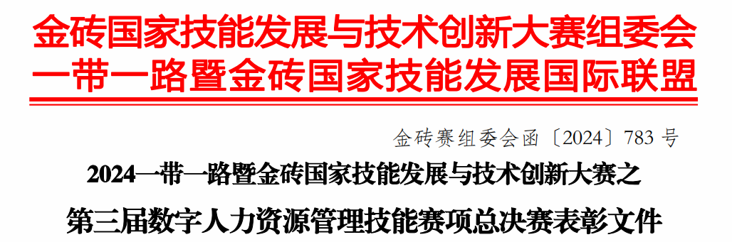 2024年“一带一路”暨金砖国家技能发展与技术创新大赛之第三届数字人力资源管理技能赛项是由金砖国家工商理事会中方理事会、“一带一路”暨金砖国家技能发展国际联盟等单位主办,金砖国家工商理事会技能发展、应用技术与创新中方工作组等单位承办,上海踏瑞科技有限公司提供技术支持的比赛。本次比赛吸引了来自南北方190多所院校,364支队伍参与。公司高度重视此次比赛,在赛前,指导老师与参赛员工积极备赛,进行了系统化培训和训练,投入大量时间准备。在比赛中,公司学子凭借多次熟练的模拟训练和优秀的临场应变能力,出色地完成了比赛,取得较为优异的比赛成绩。此次比赛是对公司数字化人力资源管理人才培养成效的一次有效检验。
