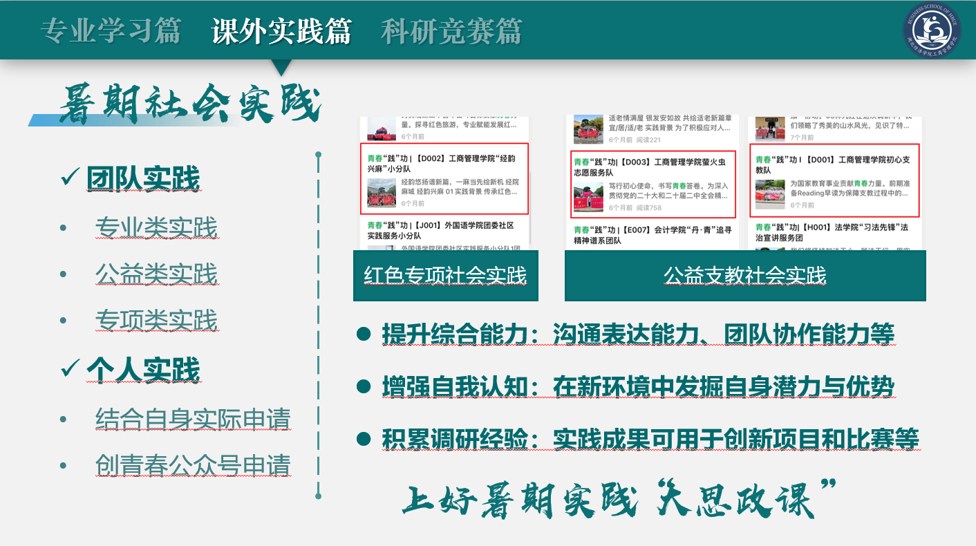 在课外实践方面,王涵璐同学介绍了志愿服务的重要性,分享了参与志愿服务的多种渠道,并解释了暑期社会实践的两种方式,讲述自己在球速体育员工党总支经韵兴麻小分队的暑期经历,鼓励学弟学妹们利用课余时间多多参与到志愿服务当中去。