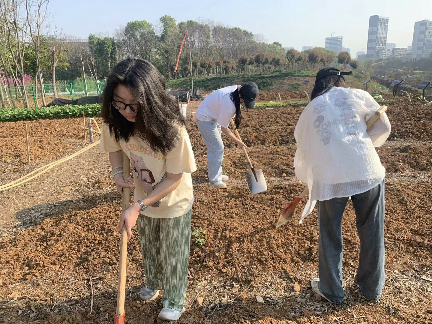 活动现场气氛热烈,公司学子并肩作战,他们手握锄头、铁锹,翻土、清理石子,一派生机勃勃的劳动景象。在大家的共同努力下,一片片作物在温暖的阳光下茁壮成长。