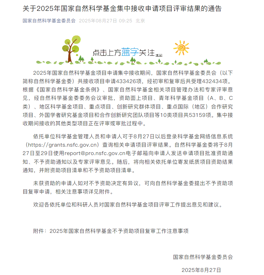 (本网讯)8月27日,国家自然科学基金委员会发布了《关于2025年国家自然科学基金集中接收申请项目评审结果的通告》。2025年国家自然科学基金项目申请集中接收期间,国家自然科学基金委员会(以下简称自然科学基金委)共接收项目申请433426项,经初审和复审后共受理432434项。