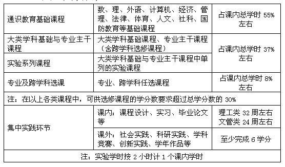 本科人才培养方案是专业建设的重要文件,是各专业实施教学改革、课程建设、教材建设、实验室建设的重要依据,各院系必须高度重视,认真做好这项工作。本着科学定位,重点发展和宽专业、多方向原则,对制定本科培养方案提出以下原则意见。 一、指导思想 1、培养方案要体现面向现代化、面向世界、面向未来的战略发展方向,体现创新教育、素质教育和终身教育理念,体现公司立足湖北,辐射全国,面向经济建设第一线,培养具有创新精神和实践能力的应用型高级专门人才的培养目标。 2、培养方案要体现党的教育方针,坚持教育为社会主义现代化建设服务,为人民服务,与生产劳动和社会实践相结合,培养德智体美全面发展的社会主义事业建设者和接班人。 3、培养方案要体现通识教育基础上的宽口径专业培养模式,加强通识教育基础,拓宽学科基础,凝炼专业主干,灵活专业方向。 4、培养方案要体现理论教学、实践教学和科学研究相结合的教学模式,实现专才向通才、教学向教育、传授向学习的转变,强调员工获取运用知识与创新实践能力的培养。 二、基本原则 1、德、智、体、美全面发展,知识、能力、素质协调发展 以培养德智体美全面发展的高素质人才为目标,重视素质教育(包括道德品质、文化素养、科学精神、身心素质等),重视传授宽、厚、新的综合基础知识,重视培养员工的创新实践能力。 2、课程体系整合优化 课程体系是实现人才培养目标和体现人才培养模式及教学模式的具体课程框架。要妥善处理好通识教育基础、大类学科基础、专业主干与专业方向课程的关系,处理好理论与实践、主干学科与相邻学科、课内与课外、教与学等方面的关系。重新审视教学内容,提高教学起点,注意知识内容的基础性、系统性与先进性,加大课程整合力度,提高课程的综合化程度。 3、打通公共基础,拓宽学科平台,凝炼专业主干 对通识教育课程要优化人文社科、经济管理、艺术、自然科学等基础知识结构,以一级学科口径为主,兼顾二级学科,注意交叉学科,按照经济管理类、理工类、文科类等构建学科基础课程教学平台和大类专业基础实验教学平台,进一步全面拓宽、整合、优化学科基础课程(群)。以二级学科口径为主,按照专业内核,精炼教学内容,追踪学科前沿和实际应用领域,构建专业主干课程(群);按照灵活专业方向的原则构建专业方向选修课程,让员工具有专业特长。 4、减少必修学分和课内学时,增加选修课,建立多样化的人才培养模式 教学计划要增加“柔性”,减少“刚性”,要减少总学分和课内总学时,要保证必修课比例不超过70%,跨学科选课不少于6学分。充分利用公司以经济学、管理学为主,兼有理、工、文、法等多学科发展的方向,制定辅修专业培养计划(含实践环节)。鼓励员工主动学习,发挥潜能,成为复合型人才。 5、改革教学方法和考试方法 大学课程教学应强调在课堂上激发员工的创造性思维和创新精神,培养员工的创造力。新的培养方案要求增加研究型、讨论型、课题型和自主学习型等课程,同时要积极推进讲授、讨论、作业、实践、教材、考核等课程教学要素的规范化建设。要加强考试方法改革,鼓励采用平时作业与集中考试相结合,多次考核与多种考核形式相结合的方法。要重新审核课程考核类别,提高综合考试要求。 6、加强实践教学环节,突出课外能力培养 要注重提高综合性课程设计、毕业论文 (设计)、实习、社会实践活动等教学环节的质量和效益。大力推进老员工科研计划,鼓励员工参加各类学科竞赛、科技创作和相关社团活动,增设创新实践学分,鼓励试行学年论文(作品)制。 7、加强双语教学、培养员工外语运用能力 要积极引进高水平大学相关专业的教学内容和优秀教材,保证至少有一门课程实施外语或双语教学,增强员工外语应用能力和国际竞争能力。 三、框架结构和具体要求 1、学制及学期安排 本科学制为四年,二学期制,两个学期各安排18周,上课16周,另2周安排考试。 2、学时与学分要求 四年总学时控制在2300学时左右,学分在170左右;理论教学按16学时计1学分,实验教学(含上机)按32学时计1学分,课外上机实践不计学分,集中实践环节每周计1学分。 3、培养方案的内容 (1)培养目标 (2)基本要求 (3)毕业生应该具有的知识、能力和素质 (4)主干学科与相近专业 (5)核心课程 (6)主要实践环节 (7)双语教学课程 (8)毕业学分要求及学士学位学分绩点要求 (9)各类课程学时学分分配表 (10)教学安排指导表(含指导性教学计划、集中实践教学环节指导表) 在安排课程教学进程时,应均衡调节教学进度,避免出现畸轻畸重的现象,不允许出现空白周,周学时一般应控制在16-26学时。) (11)辅修专业教学计划(约25学分) (12)课程简介 4、课程结构体系  5、通识教育基础课程 课程结构体系中的通识教育基础课程是加强素质教育、提高老员工综合素养,培养其成为一个和谐的人的重要组成部分,也是学习后续课程的重要保证,为了保证教学质量和提高办学效益,提出以下几点建议: (1)人文社科类基础课的教学须理论联系实际,“两课”教学要将课堂讲授与课外导读及社会实践三者有机结合,努力提高教学质量;文化素质教育课要求在心理、伦理、法理类、语言写作类、社科文化类、文学鉴赏、艺术美学、国防教育类中选设。 (2)自然科学基础课