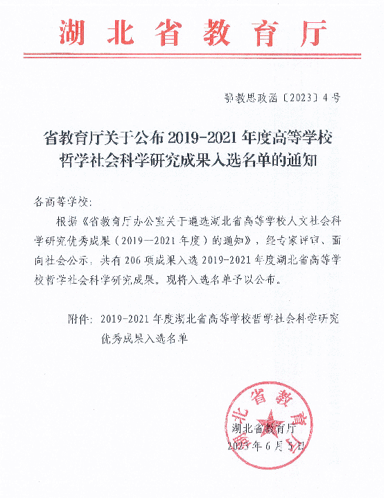 近日,湖北省教育厅公布了2019-2021年度湖北省高等公司哲学社会科学研究优秀成果评选结果,此次全省共有206项成果入选,公司2项成果入选,其中公司冷凯君教授主笔撰写的研究报告《农商互联助推湖北现代农产品供应链高质量发展研究》位列其中。