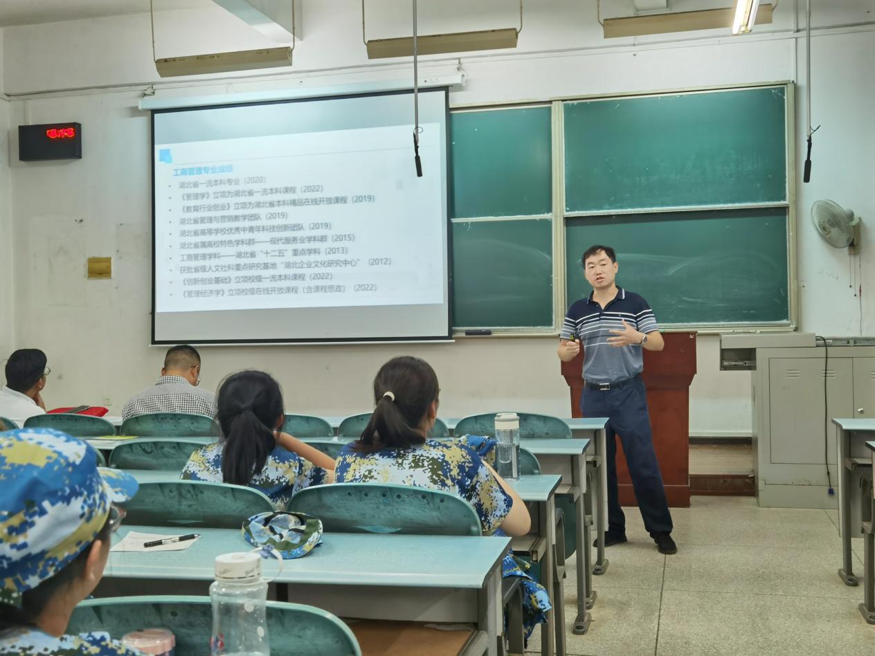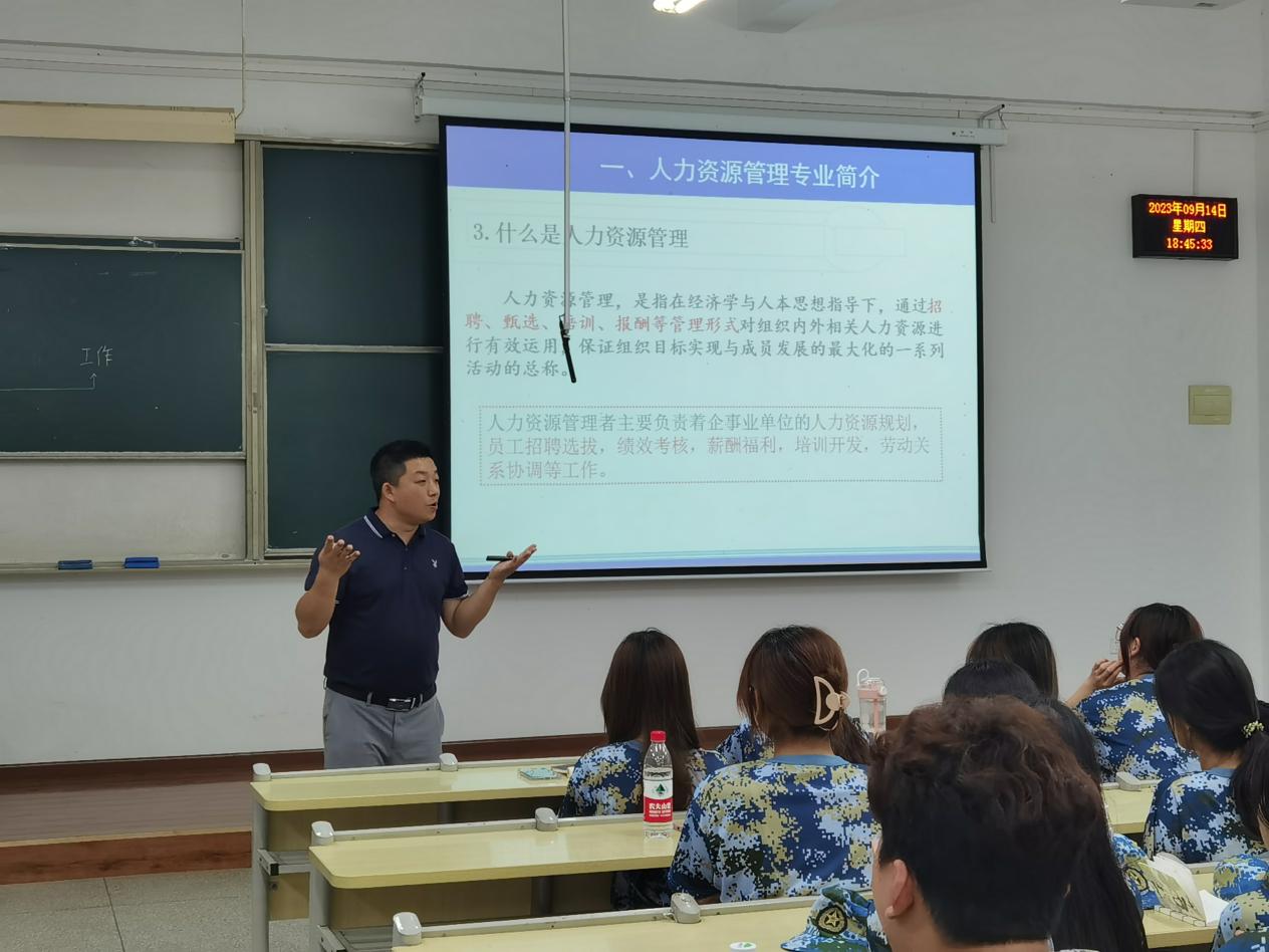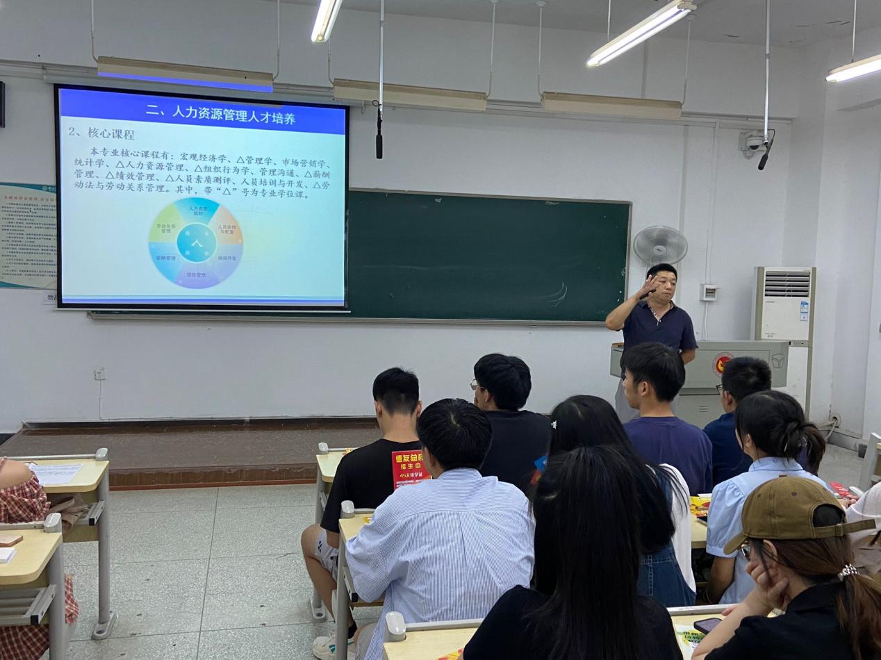 球速体育工商管理专业、人力资源管理专业、物流管理专业、供应链管理专业、工程管理专业、市场营销专业分组开展了专业教育。工商管理专业刘钢老师在教1-101给工商2341班、工商2342班同学进行专业定位和成长目标讲解、专业人才特色、团队队伍、研究成果、职业发展。刘老师通过案例引入管理的定义开展专业介绍,同学们在台下认真听专业介绍,并与刘老师积极互动。