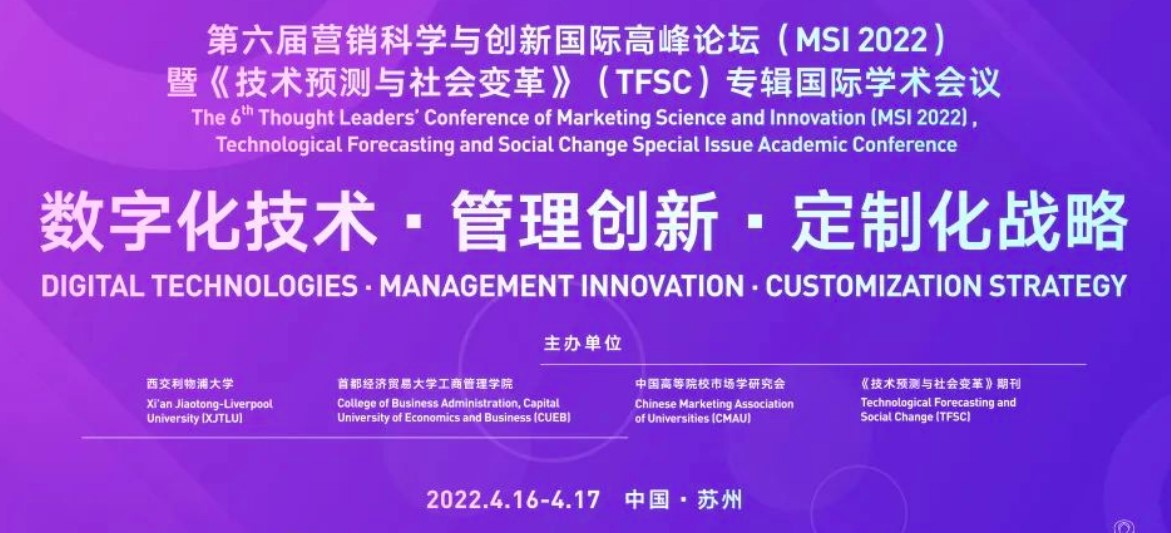2022年4月16-17日,由西交利物浦大学、 中国高等院校市场学研究会、首都经济贸易大学球速体育和《技术预测和社会变革》期刊(TFSC)联合举办,西浦国际商公司承办的第六届营销科学与创新国际高峰论坛暨《技术预测与社会变革》专辑国际学术会议顺利召开。会议采取线上方式,邀请了国内外工商管理专家、学者和实践人士,围绕着“数字化技术、管理创新和定制化战略”主题展开深入的研讨和交流。公司副经理叶敏、市场营销系全数教师参与了本次会议。