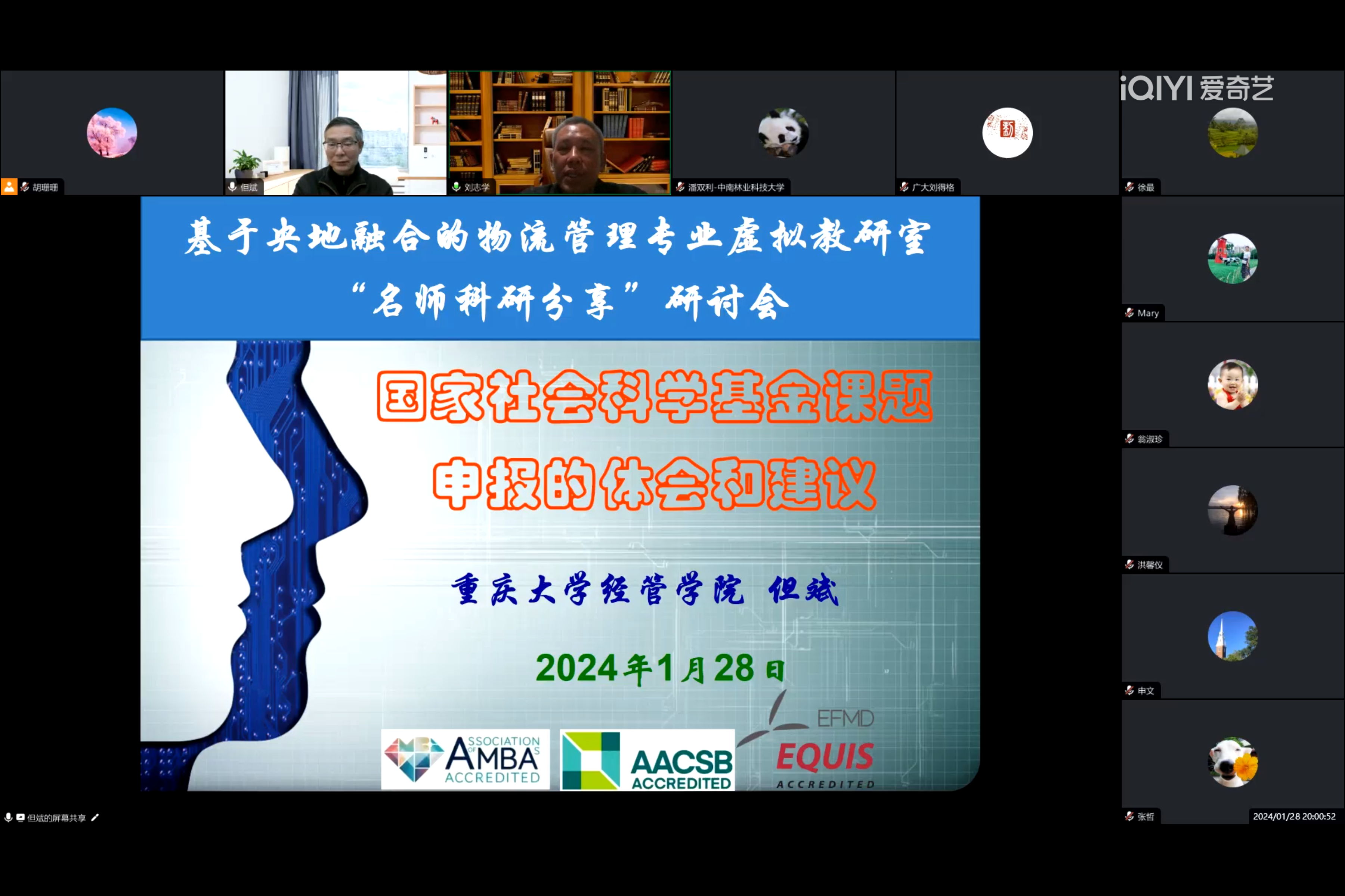 本网讯(通讯员 汪利虹)2024年1月28日晚8:00-9:30,基于央地融合的物流管理专业虚拟教研室举办研讨会,邀请重庆大学二级教授、博士生导师,教育部高校物流教指委委员、中国物流学会副会长、国务院政府津贴专家但斌教授作“国家社会科学基金申请的体会和建议”讲座。本次活动由公司特聘教授、虚拟教研室负责人、教育部物流管理与工程类专业教指委副主任委员、球速体育刘志学教授主持,公司教师和来自北京、上海、江苏、浙江、安徽、福建、湖北、湖南、河南、广东、重庆、云南、贵州、陕西、甘肃等共150余位国内高校教师参加研讨活动。