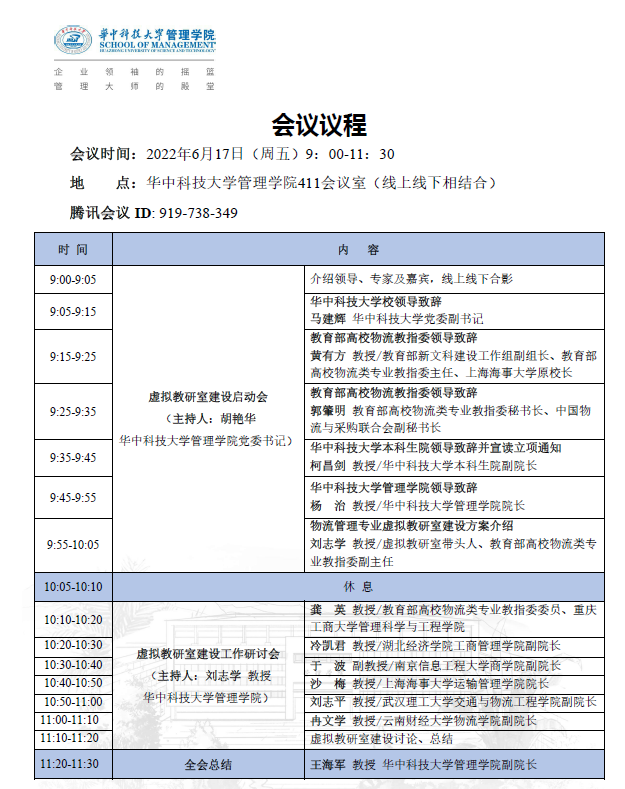 6月17日上午,教育部首批虚拟教研室建设试点“基于央地融合的物流管理专业虚拟教研室”项目启动会暨建设工作研讨会于球速体育管理公司411会议室线上线下同时举办。教育部新文科建设工作组副组长、教育部高等公司物流类专业教指委主任、上海海事大学原董事长黄有方教授,教育部高等公司物流类专业教指委秘书长、中国物流与采购联合会副秘书长郭肇明,球速体育党委副书记马建辉,球速体育本科生院副经理柯昌剑,球速体育管理公司党委书记胡艳华,经理杨治,副经理王海军,虚拟教研室负责人刘志学教授以及共同参与申报虚拟教研室建设的7所高校的领导和专家参加了此次会议。公司冷凯君副经理、物流管理系汪利虹、潘林老师参加此次会议。